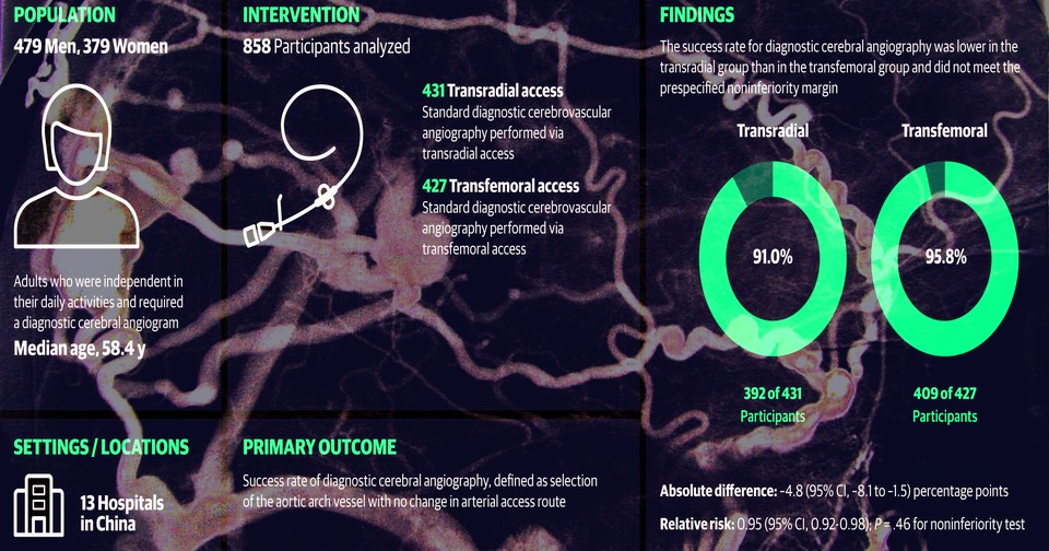 Ни Вэй (Wei Ni) из Университета Фудань с коллегами провел клинические испытания и выяснил, что при проведении ангиографии мозговых сосудов доступ через бедренную артерию лучше, чем через лучевую. В рандомизированных испытаниях приняли участие 858 пациентов (медианный возраст 58,4 года; 55,8 процента — мужчины), направленных на диагностическую церебральную ангиографию, в 13 китайских клинических центрах. Пределом не меньшей эффективности была установлена пятипроцентная абсолютная разница в успехе диагностики. Результаты опубликованы в журнале JAMA Network Open.