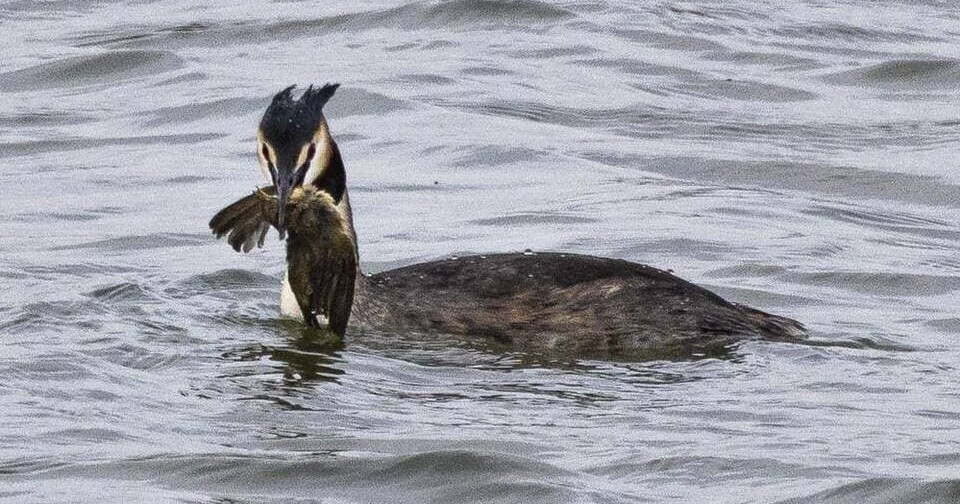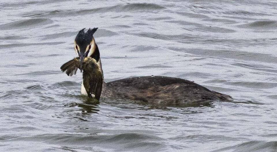 Чомга (<i>Podiceps cristatus</i>) с пойманной пеночкой-теньковкой (<i>Phylloscopus collybita</i>)