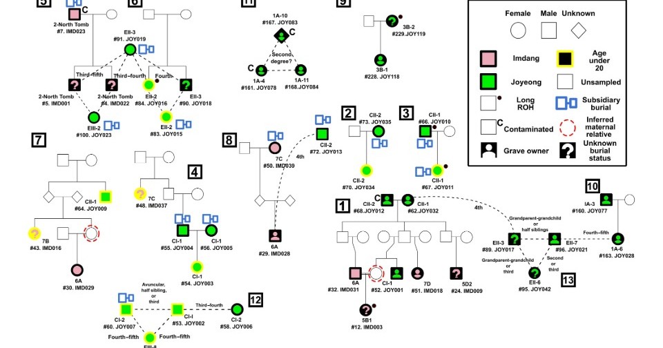 Ученые не выявили близкого родства между привилегированными владельцами гробниц и принесенными в жертву людьми, хотя достаточно длинные общие по происхождению блоки сцепления (IBD) в их геномах указали на то, что они происходили из одной популяции с общим фоновым родством. При этом как среди владельцев гробниц, так и принесенных в жертву людей присутствовали индивиды (не меньше пяти человек), родители которых приходились друг другу весьма близкими родственниками. В частности, одна представительница элиты, по-видимому, родилась в браке между двоюродными братом и сестрой. Это не только подтверждает исторические сведения о подобных союзах в государстве Силла, но и говорит о замкнутости этой общности.