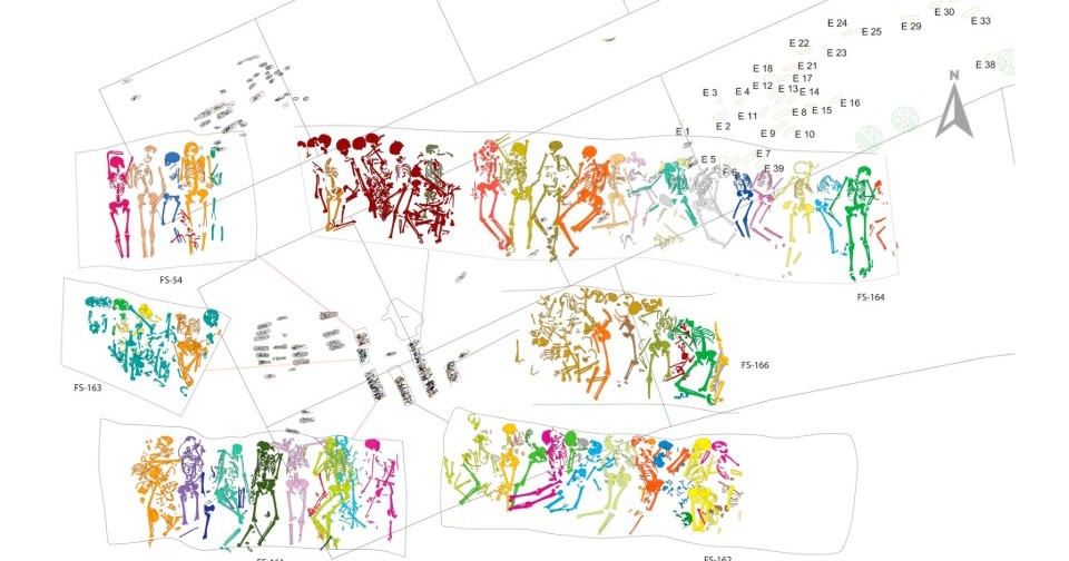В братских могилах археологи обнаружили останки 69 человек (некрополь раскопан не полностью, поэтому, возможно, что аналогичные захоронения остались не исследованы), примерно у трети из которых антропологи выявили признаки насильственной смерти, в частности, предсмертные травмы головы. Образцы костей или зубов 16 человек из всех шести коллективных захоронений ученые отправили на генетический анализ, который, в частности, позволил определить пол 11 человек (четверо были мужчинами, семеро — женщинами), а также установить, что среди этих индивидов не было родственников первой и второй степени.