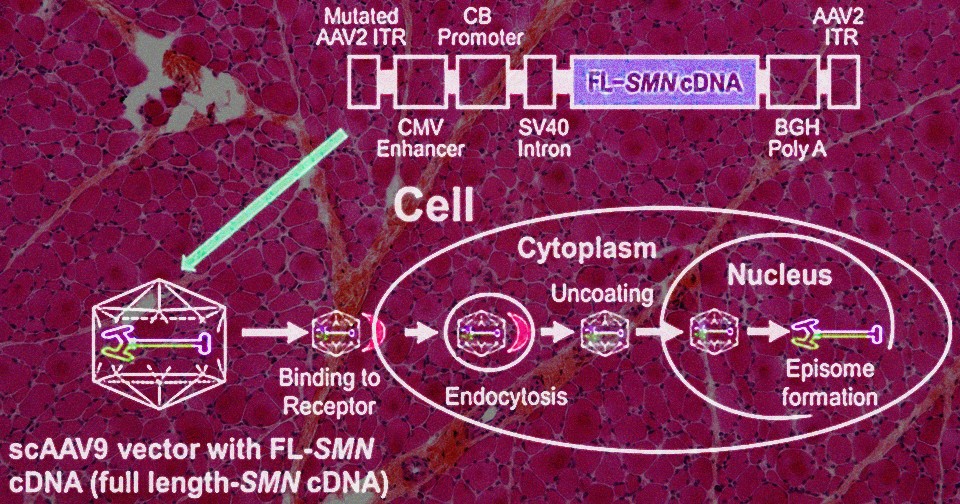 Существует и геннотерапевтический препарат онасемноген абепарвовек (торговое название «Золгенсма», одно из самых дорогостоящих лекарств в мире), который однократно вводят внутривенно. Он представляет собой рабочий ген SMN1 на аденоассоциированном векторе AAV9 и стойко восстанавливает синтез SMN. В США, России и некоторых других странах этот препарат показан только детям в возрасте до двух лет, в Евросоюзе — массой тела до 21 килограмма. В первую очередь это связано с тем, что доза рассчитывается на килограмм массы тела (1,1 × 1014 векторных геномов на килограмм), и у более крупных детей высок риск системных побочных эффектов, в том числе гепатотоксичности и кардиотоксичности. Чтобы расширить круг показаний, производитель «Золгенсмы» компания Novartis разработала форму препарата OAV101 IT, предназначенную для интратекального введения с целью уменьшить риск системных эффектов. В испытаниях второй фазы она показала хорошие результаты у детей до пяти лет.