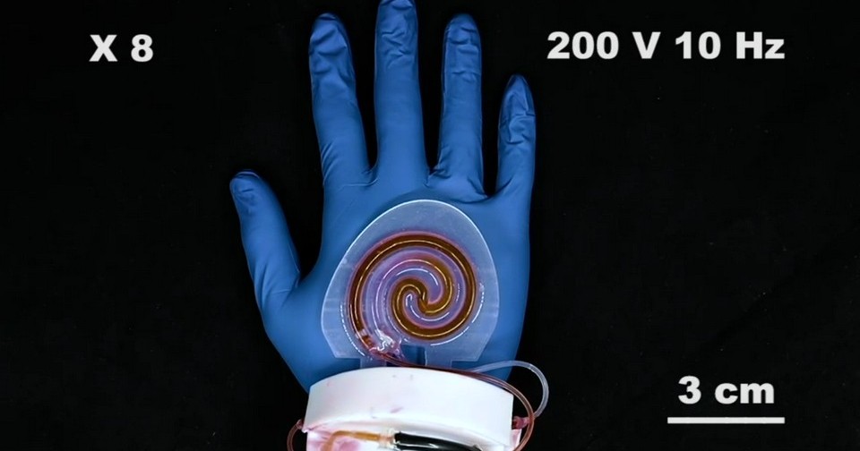 На основе этих актуаторов инженеры собрали несколько мягких устройств, для каждого спроектировав компактную гибкую электронную плату. Носимый на запястье перистальтический насос на цилиндрическом актуаторе оказался способен перекачивать воду со скоростью около 1,9 миллилитра в минуту при 200 вольтах, стабильно работая на протяжении более 100 тысяч циклов. Робот-манта с плоским 20-слойным актуатором плавал со скоростью 0,2 длины тела в секунду при 200 вольтах, а робот в форме луны-рыбы длиной 8,5 сантиметра на двух актуаторах ― со скоростью 0,13 длины тела в секунду. При этом независимое управление актуаторами позволяет роборыбе поворачивать. Ползающий робот, изготовленный ламинированием 30-слойного HK-PHDE актуатора прямо поверх электронной платы, ползал со скоростью 0,33 сантиметра в секунду при напряжении 200 вольт. Исследователям удалось запитать его от стандартной бытовой электросети 220 вольт вместо батареи.