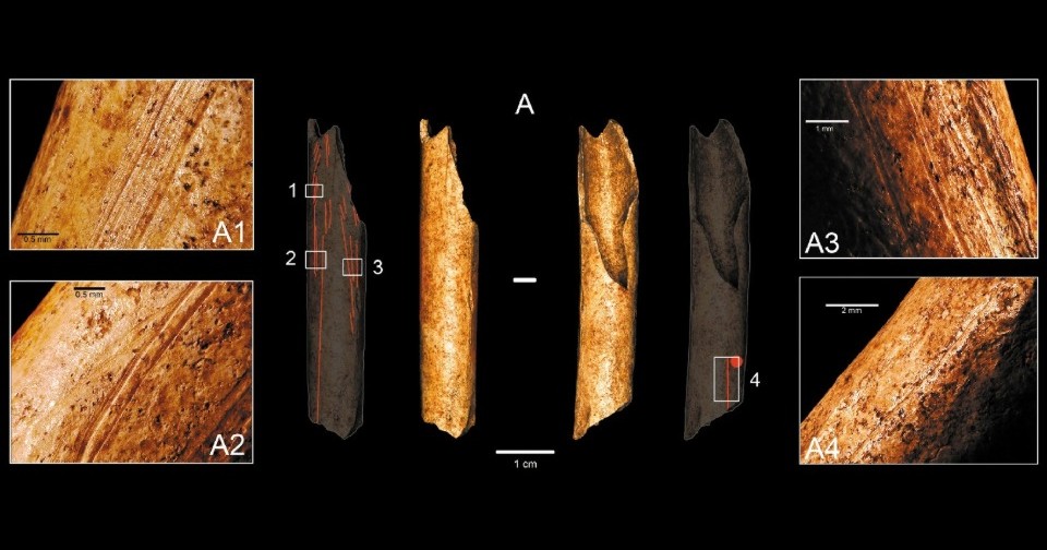 На 13 костях исследователи выявили явные следы (например, порезы), связанные с деятельностью людей. В частности, повреждения присутствовали на костях ушастой совы (Asio otus), серой неясыти, беркута (Aquila chrysaetos) и белоголового сипа (Gyps fulvus) — крупных хищных птиц. Ученые заметили на многих находках свидетельства того, что люди ловили птиц в том числе ради мяса. Но расположение порезов на костях беркута и белоголового сипа в местах, где практически его нет, говорят в пользу того, что с добытых тушек, по-видимому, срезали перья.