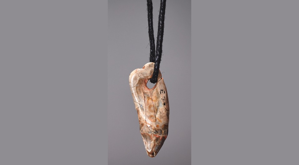 Подвеска из тюленьего зуба и старинные музейные карточки с информацией о находке. На левой указано, что артефакт сделан из барсучьего зуба, на правой — из волчьего