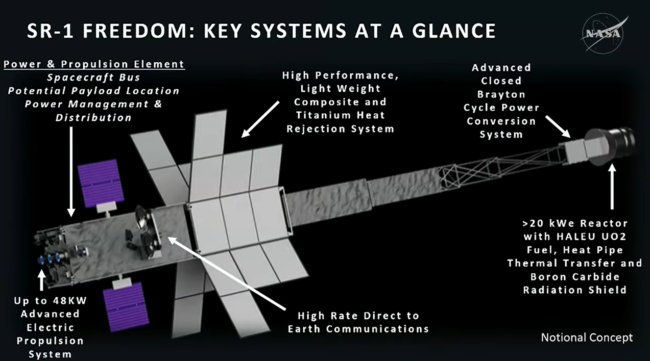 24 марта 2026 года NASA объявило, что планирует до конца 2028 года запустить в космос аппарат Space Reactor-1 Freedom, который должен стать первым демонстрационным межпланетным аппаратом с ядерной электродвигательной установкой. Она будет оснащена ядерным реактором с электрической мощностью более двадцати киловатт, который будет работать на топливе из высококонцентрированного диоксида урана с содержанием изотопа 235U от пяти до двадцати процентов. Радиационная защита реактора будет выполнена из карбида бора, а вырабатываемая электроэнергия будет питать ксеноновые ионные двигатели. В состав аппарата также войдут система преобразования тепловой энергии реактора в электрическую энергию, охладители, система связи и навигации, а также солнечные батареи.