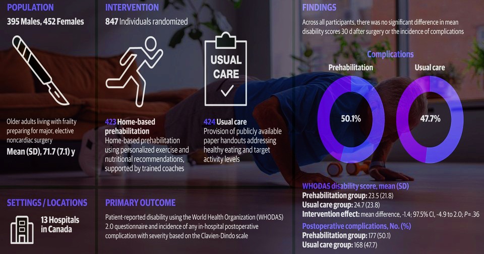 Дэниел Макайзек (Daniel McIsaac) из Оттавского университета с коллегами провел клинические испытания и выяснил, что преабилитация перед плановыми операциями может существенно снизить недееспособность после них у пожилых пациентов, но только у тех, кто выполняет ее не менее, чем на три четверти. В мультицентровых рандомизированных испытаниях PREPARE приняли участие 847 пациентов (средний возраст 71,7 года, 53,4 процента — женщины) со старческой астенией, готовящихся к плановым хирургическим вмешательствам. Половине из них назначили преабилитацию (комплекс активных профилактических мер перед операцией с целью улучшения ее исходов, в данном случае это были физические упражнения и советы по диете), другой половине дали стандартные рекомендации. Медианный срок включения в программу составил четыре недели (3–7 недель). Результаты испытаний опубликованы в журнале JAMA Surgery.
