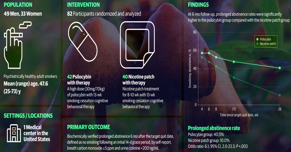 Мэтью Джонсон (Matthew Johnson) из Университета Джонса Хопкинса с коллегами провел пилотные клинические испытания и выяснил, что однократное назначение высокой дозы псилоцибина с психотерапией помогает бросить курить сигареты в разы эффективнее, чем курс никотиновых пластырей с аналогичной психотерапией. В рандомизированных испытаниях приняли участие 82 психически здоровых взрослых курильщика (средний возраст 47,6 года; 59,8 процента — мужчины). Случайным образом они получили высокую дозу псилоцибина (30 миллиграмм на 70 килограмм массы тела) однократно или курс одобренных к применению никотиновых пластырей продолжительностью 8–10 недель. Обе группы также получили 13-дневную программу когнитивно-поведенческой психотерапии с руководством для бросающих курить. Результаты опубликованы в журнале JAMA Network Open.