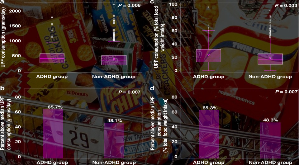 У 111 участников был клинически подтвержденный диагноз СДВГ. Медианное потребление ультраобработанной пищи участниками составило 342,9 грамма в день или 16,7 процента от всей массы пищи. После введения поправок на возраст, пол, социоэкономический статус, потребление энергии, клетчатки и альфа-линоленовой кислоты наличие СДВГ оказалось значимо связано с потреблением ультраобработанной пищи выше медианного количества как в граммах в день (отношение шансов 1,622), так и в процентах от массы пищи (отношение шансов 1,652). Существенных различий в потреблении ультраобработанной пищи между принимавшими и не принимавшими психостимуляторы по поводу СДВГ выявлено не было.