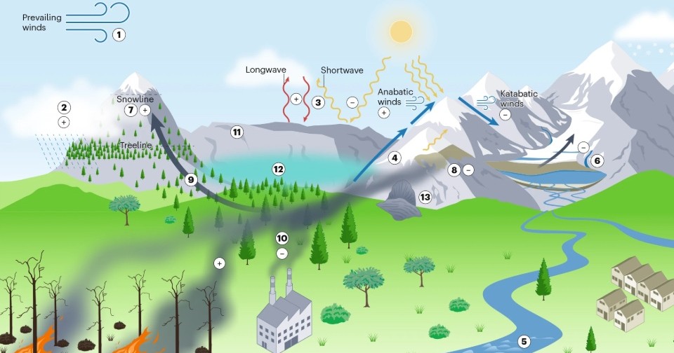 За последние 40 лет горные территории нагрелись сильнее, чем низины, в среднем на 0,084 градуса. В них выпадало в среднем на 4,6 миллиметра меньше осадков, а толщина снежного покрова в них уменьшилась на 10,2 миллиметра. До конца века эта тенденция будет сохраняться: потепление в горах будет происходить на 0,13 градуса в 100 лет быстрее, чем среднем по планете. Так происходит из-за таяния снежного покрова в горах, которое ведет к понижению альбедо и снижению количества осадков, питающих ледники — а значит, страдают и истоки рек, от которых зависит жизнь миллиарда человек. Об этом говорится в статье, опубликованной в журнале Nature Reviews Earth & Environment.